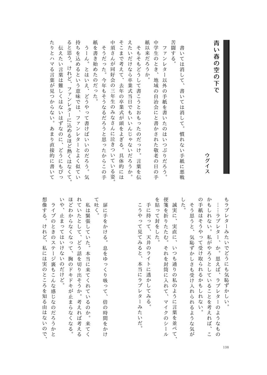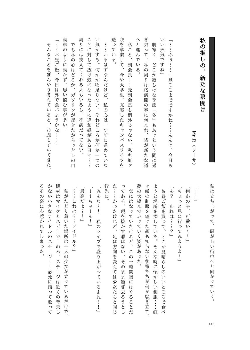 4/16僕ラブにて頒布の「せつ菜さんに大好きを叫ぶ合同 これは始まりのうた」の作品を紹介します⑥※敬称略 漫画:ダーマン @RakanKen_AC 小説:ウグイス @KouhakubaiU Mr.R @MrRSS_SaberStar 時任翼 @TOKITSUBA 委託bit.ly/itaku2304 #せつはる合同 続→