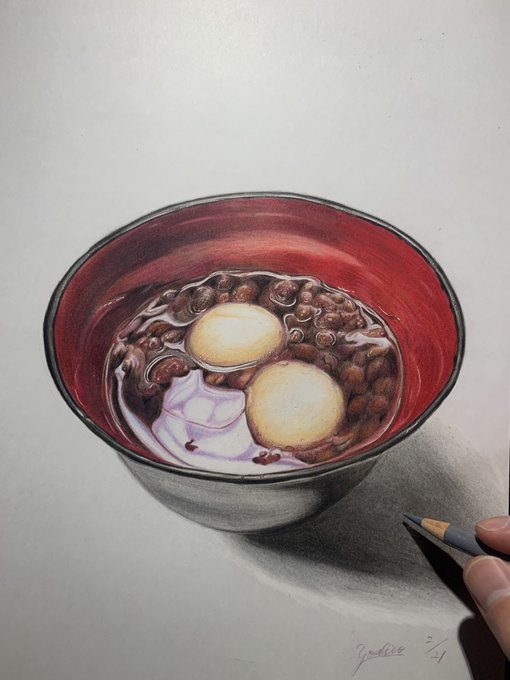 色鉛筆で描いた「ぜんざい」✨ ぼんぼん先生の 色鉛筆画講座で描いたお題🧑🏼🎨 ちなみに、 沖縄のぜんざいは氷たっぷりで美味しいですよね( ੭˙ᗜ˙)੭ #色鉛筆画 #色鉛筆 #ぜんざい #colorpencil #colorpencildrawing