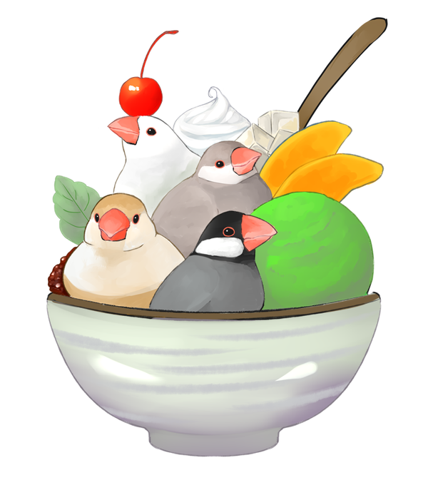 休憩。勝手に文鳥さんとぜんざいデザートをコラボさせました。もちもち。 #イラスト #鳥 #文鳥 #ぜんざい #デザート #illustration #bird #paddybird #javasparrow