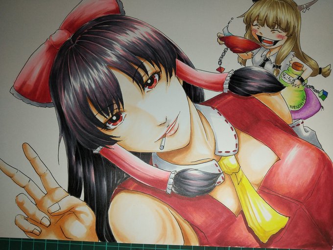 嫉妬の日なので勇パル描きました。 頭ガシガシ撫でられて 「あっ・・・あっ・・・!」ってなってる所。 なかなか良いので見てって。 #東方Project #アナログ #そばかす式 #水橋パルスィ #星熊勇儀 #4月10日はパルスィの日