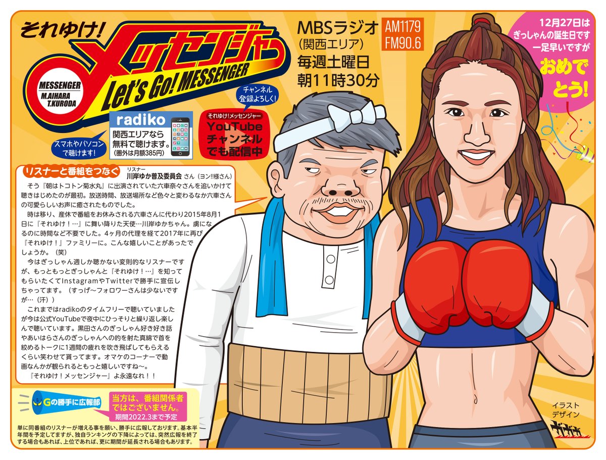 MBSラジオ #それゆけメッセンジャー を勝手に広報中😀。放送は土曜朝11時30分! 今回はぎっしゃん応援でおなじみ、川岸ゆか普及委員会さんこと、ヨン様さんに文章をお願いしました😃。尚27日はぎっしゃんの誕生日です。「いいね」やリツイートいただくと助かります🙏😘。 #絵描きさんと繋がりたい