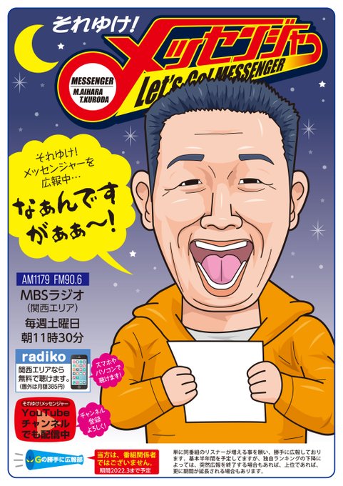 MBSラジオ #それゆけメッセンジャー を勝手に広報しております😀。絵はビッグムーン大月さんです😁。異名に合わせて夜の絵にしましたが、放送は土曜朝11時30分からの番組ですよ😙! #絵描きさんと繋がりたい