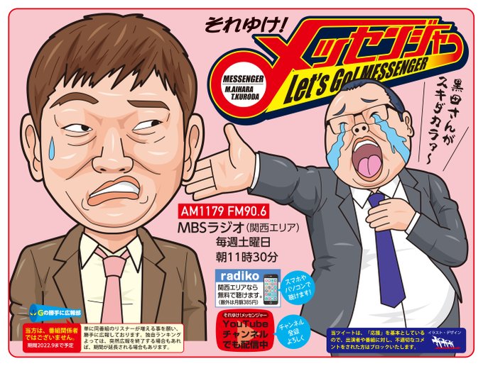 MBSラジオ #それゆけメッセンジャー を勝手に広報しております😀。今日のアシスタントは「ダイカイさん言っといてくださいよー!」でおなじみのぎっしゃんです😁。放送は土曜朝11時30分から! #絵描きさんと繋がりたい