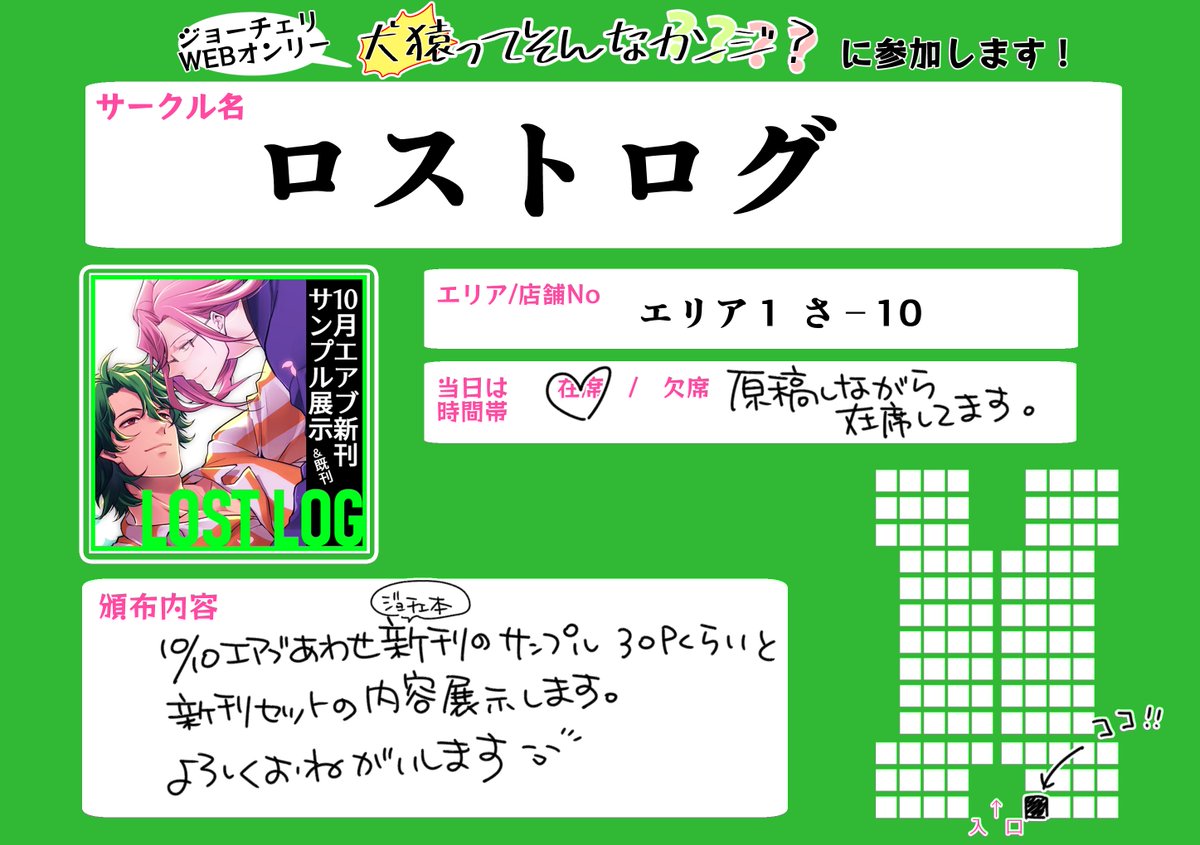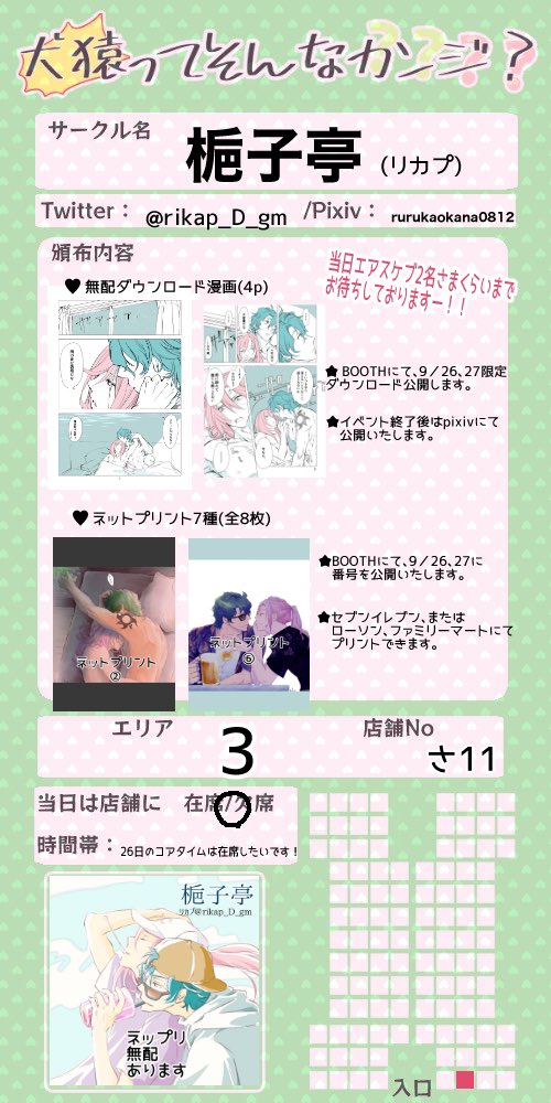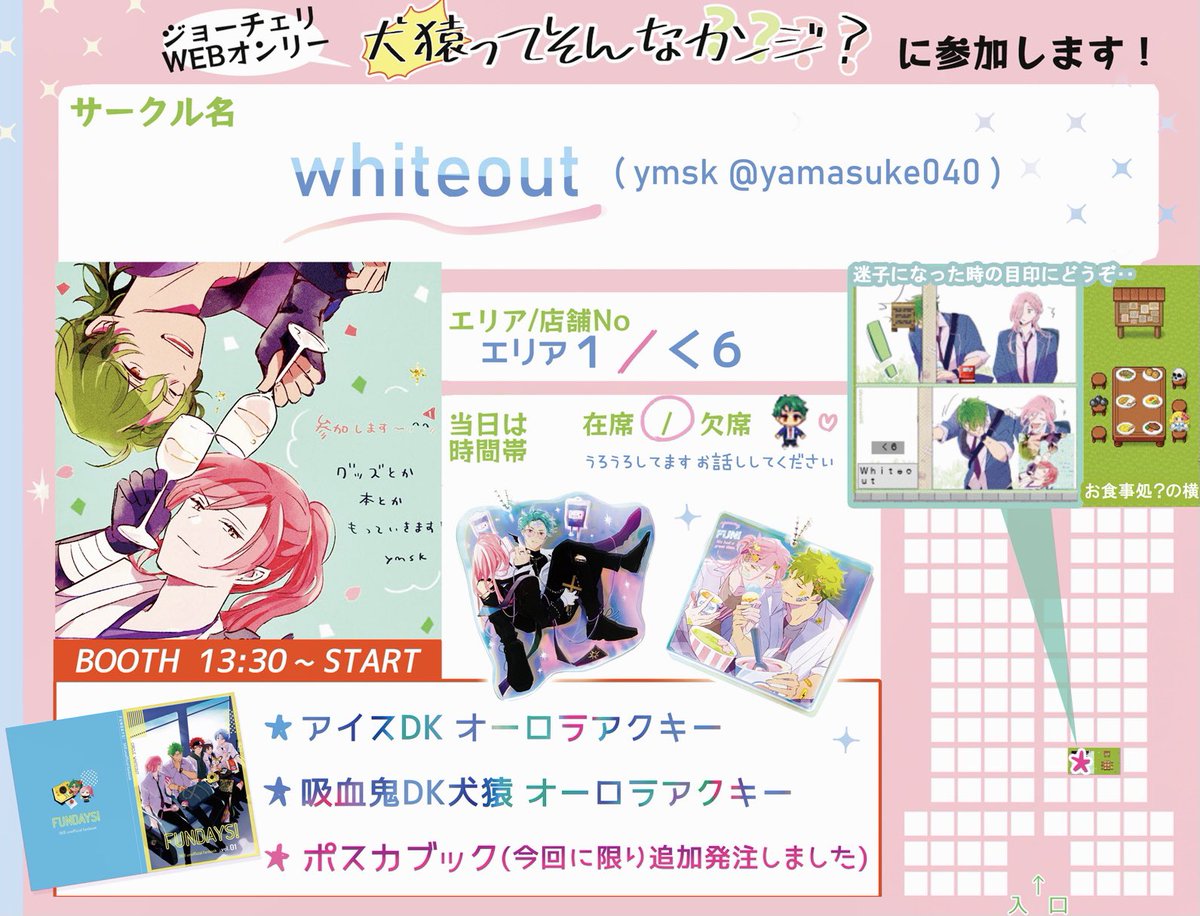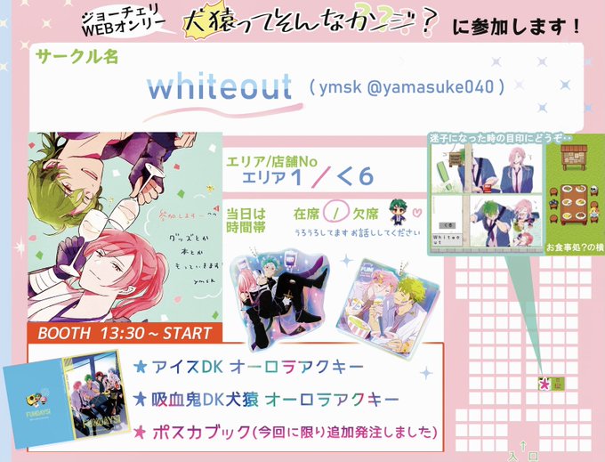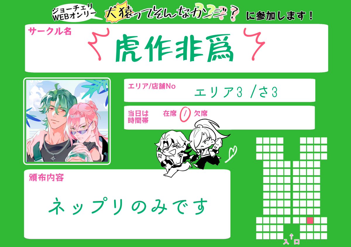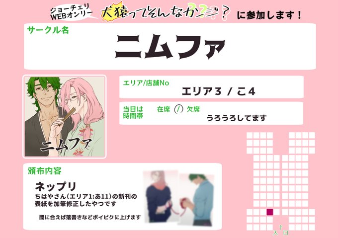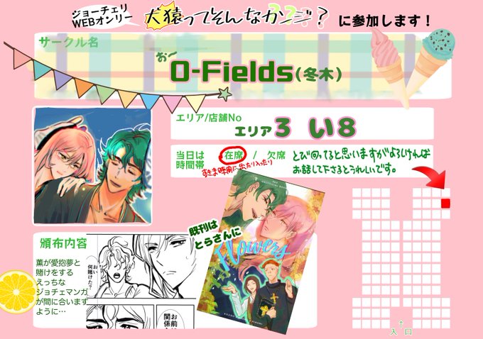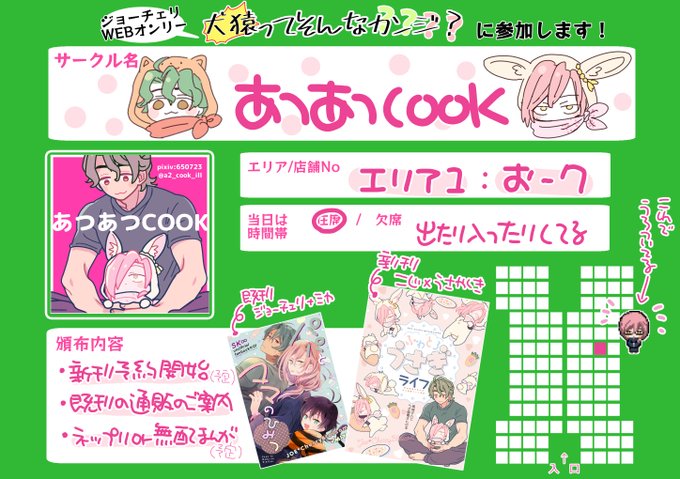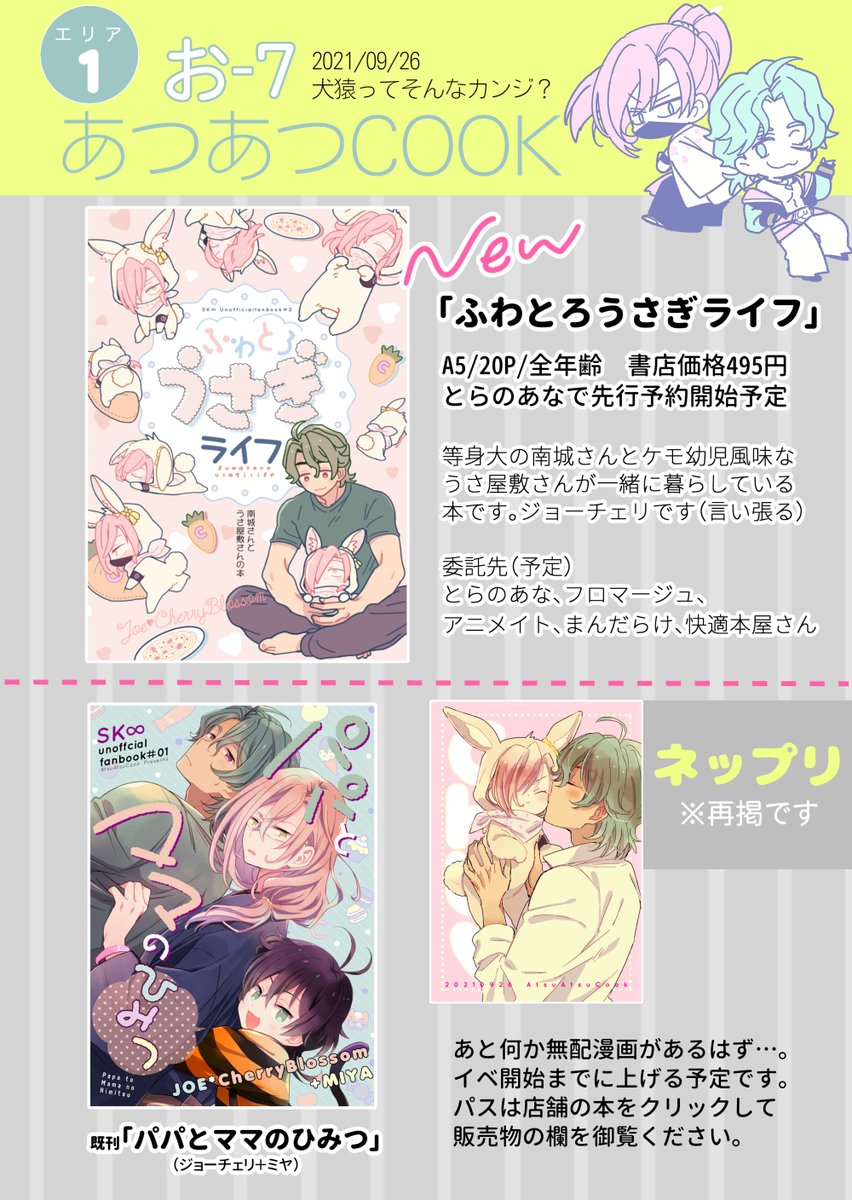 9/26🐯🌸webオンリー「犬猿ってそんなカンジ?」 エリア1:お7「あつあつCOOK」 10月発行のうさ屋敷本とらのあなにて予約開始予定です。その他間に合えば何かあります。 #そんなジョーチェリ