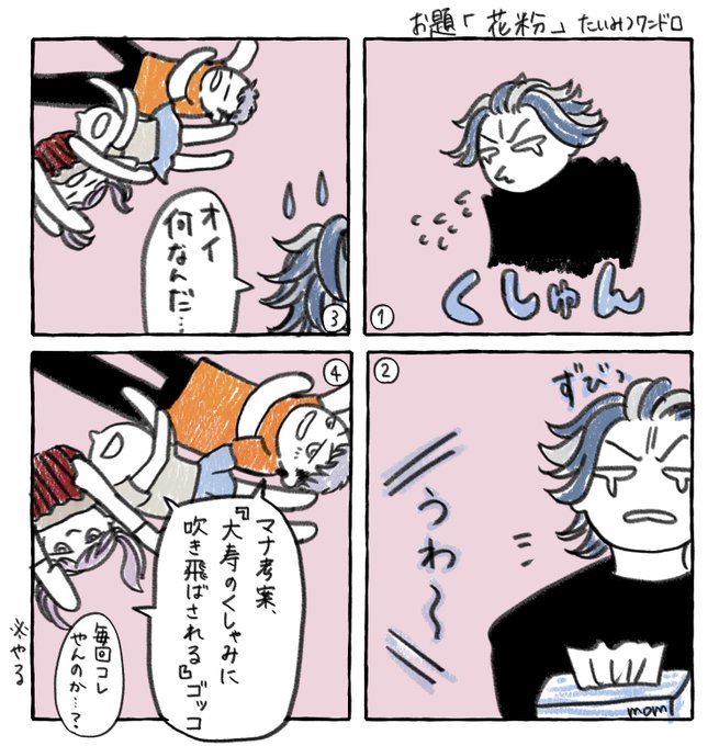 お題「花粉」 開催ありがとうございます。 花粉症たいじゅはよわよわで可愛いし世話焼くのがひそかに毎年楽しいみつやです。花粉症でずるずるでも顔がいいたいじゅ!みつやの春の季語は「たいじゅの花粉症」 #たいみつ版ワンドロライ