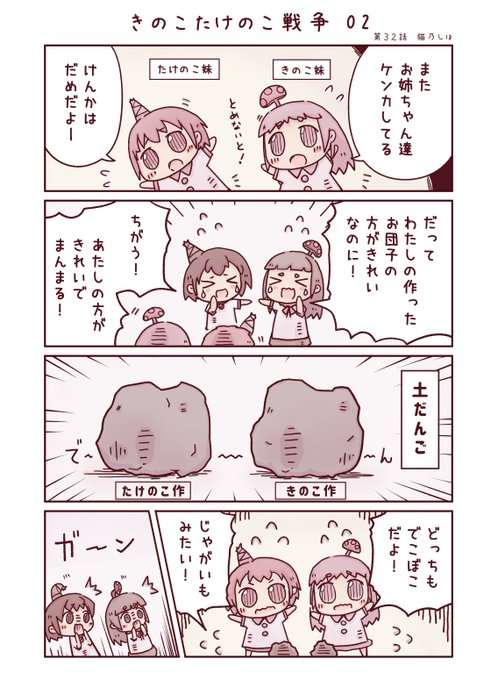 【植木さん家のチューリップ】 第33話 「きのこたけのこ戦争 03」 3/3 にょきっと解決! #きのこの山 #たけのこの里 #創作漫画 #4コマ漫画 #漫画が読めるハッシュタグ #きのこたけのこ戦争 #イラスト