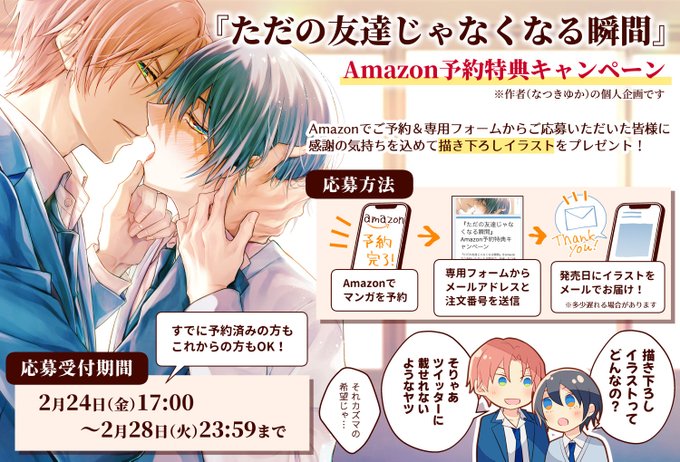 3/17発売『#ただの友達じゃなくなる瞬間』 🎊Amazon予約特典キャンペーン🎊 Amazonで即予約してくださった方に特典がないのは申し訳なさすぎたので、特典キャンペーンを個人ですることにしました!(受付期間短いのでご注意) ⏬ご希望の方はリプ欄をご覧ください