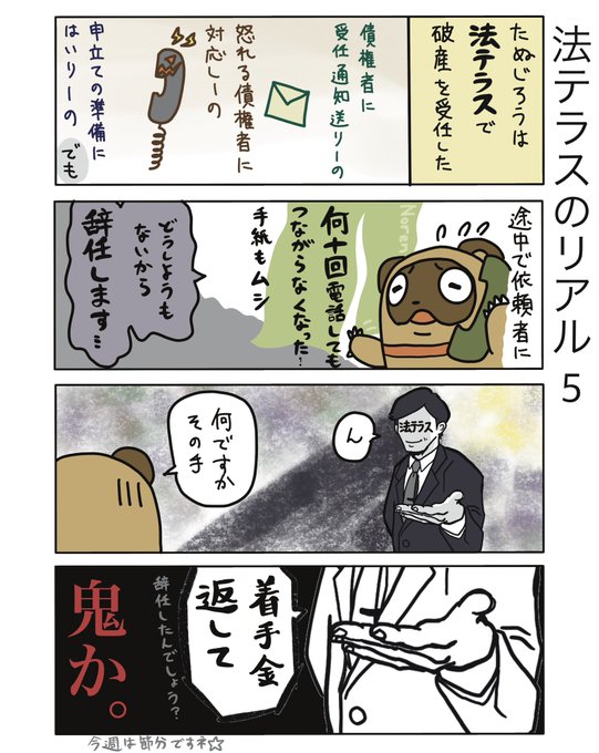 【法テラスのリアル5】 着手金ってそーゆーんじゃないからね… 7~8割くらい返還求められることが多いみたいです。鬼か。 #弁護士 #漫画が読めるハッシュタグ #たぬじろう #食っていけない弁護士