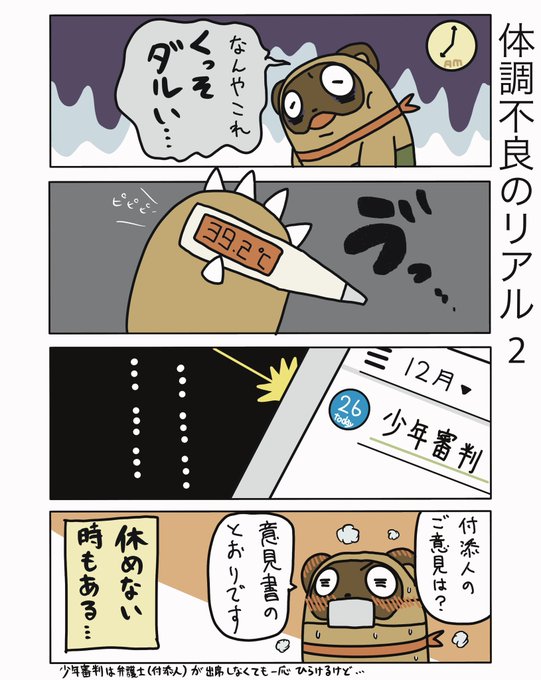 【体調不良のリアル2】 1年目の時の話ですな… 少年が年末年始自宅で過ごせるかどうかってところだったから… (この前休んだ皺寄せがきてるので、更新まばらになってます苦笑) #弁護士 #漫画が読めるハッシュタグ #たぬじろう #食っていけない弁護士