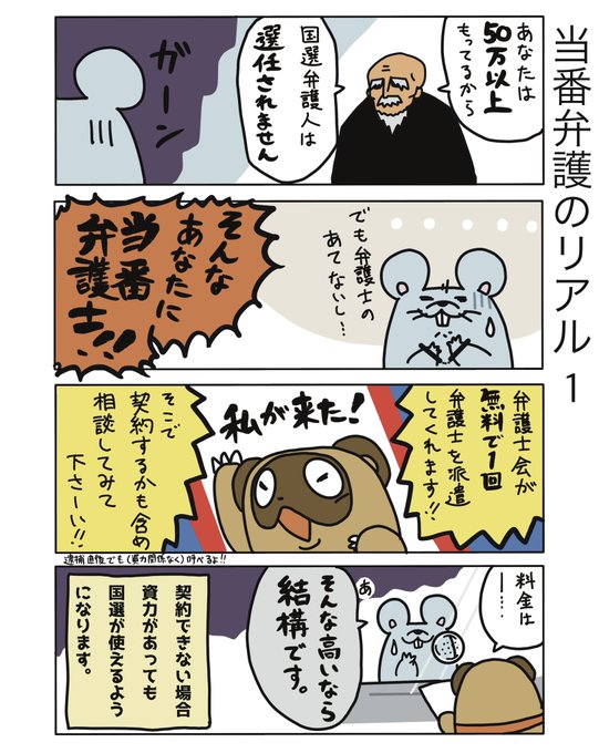 【当番弁護のリアル1】 当番弁護士は逮捕直後でも呼べるから(国選は逮捕から2日後くらい[勾留という段階に入ってから]に選任される)、覚えておくと良いですよ! #弁護士 #漫画が読めるハッシュタグ #たぬじろう #食っていけない弁護士