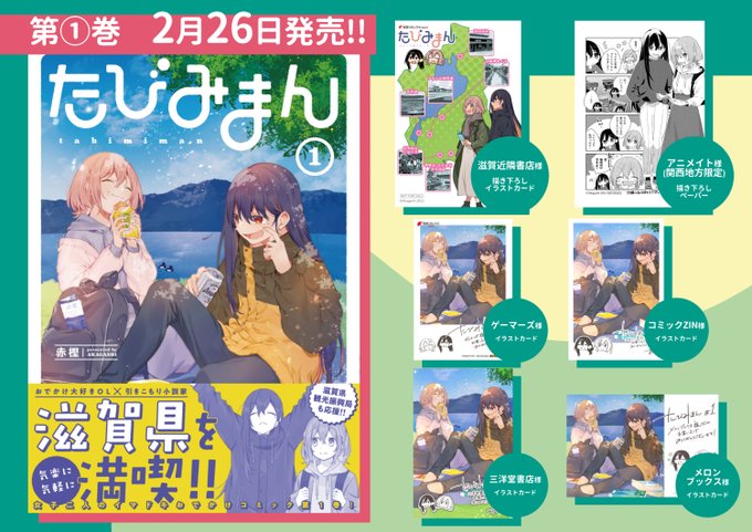 【告知】 社会人女子ふたりが滋賀をゆるく歩く漫画 「たびみまん」第①巻2月26日発売です! 各書店様の特典情報をまとめました! なにとぞよしなに~! ※対象の滋賀近隣書店様につきましては画像のリストをご確認ください 試し読みはこちらから👇 comic-walker.com/contents/detai… #たびみまん