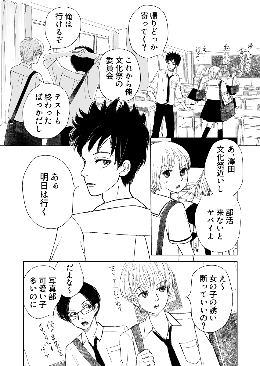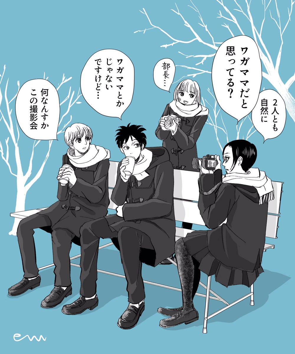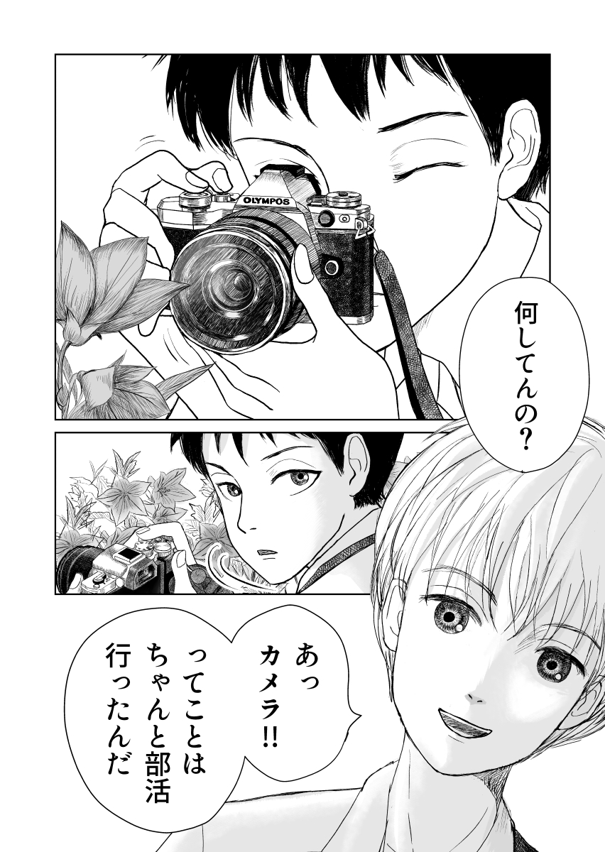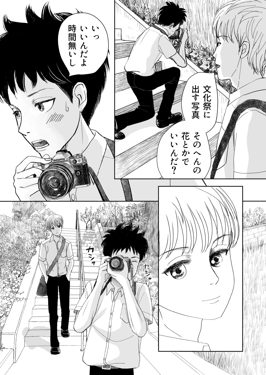 #リプ来たセリフで一コマ描く 雲丹ちゃんリクエスト 『ワガママだと思ってる?』 華ちゃんで描くか迷ったけど、#たぶちが (2話参照)の写真部部長が高校卒業の日、『私も相澤の笑顔の写真撮りたい』と高校最後の撮影会したいと。 ワガママかなと気にするイイ奴な部長卒業おめでとう㊗️ twitter.com/harapekouni/st…