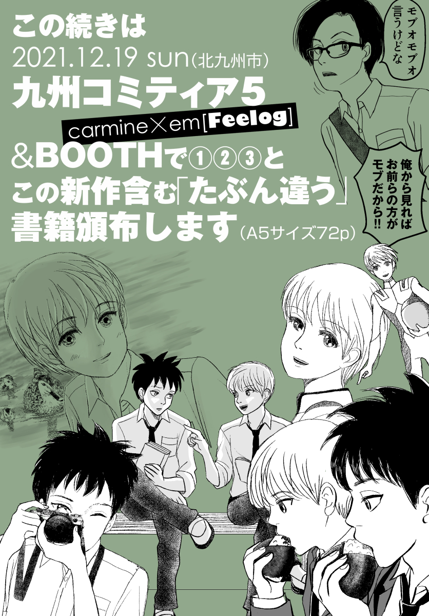 #たぶん違う(A5/72p+emイラスト担当[二月の台所]DLコード付ブック特典付)書籍化してBOOTHで販売中 ①②③話と最新の④話収録。画像は④の冒頭部分。 現在④の続きは本でしか読めません🙇 ↓BOOTHのリンク |em[maki]'s shop makiweb.booth.pm/items/3482806 #booth_pm #たぶちが #一次創作絵師拡散フェス02