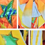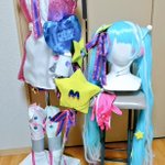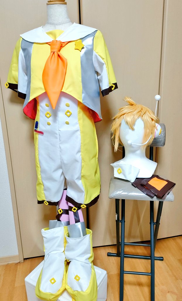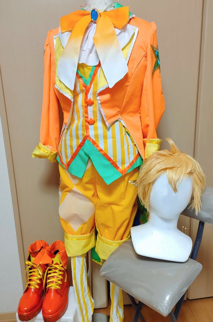 ワンダショのレンくんできたー!! お星様たくさんキラキラにしたよ!ストライプタイツ縫うの地獄だった😇 胸のリボンのグラデーション綺麗にできて満足〜!アイロンがけは明日の私が頑張る! #たまごの衣装自作部屋 #prsk_cos