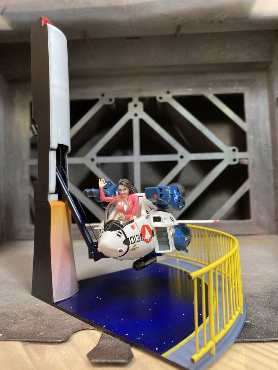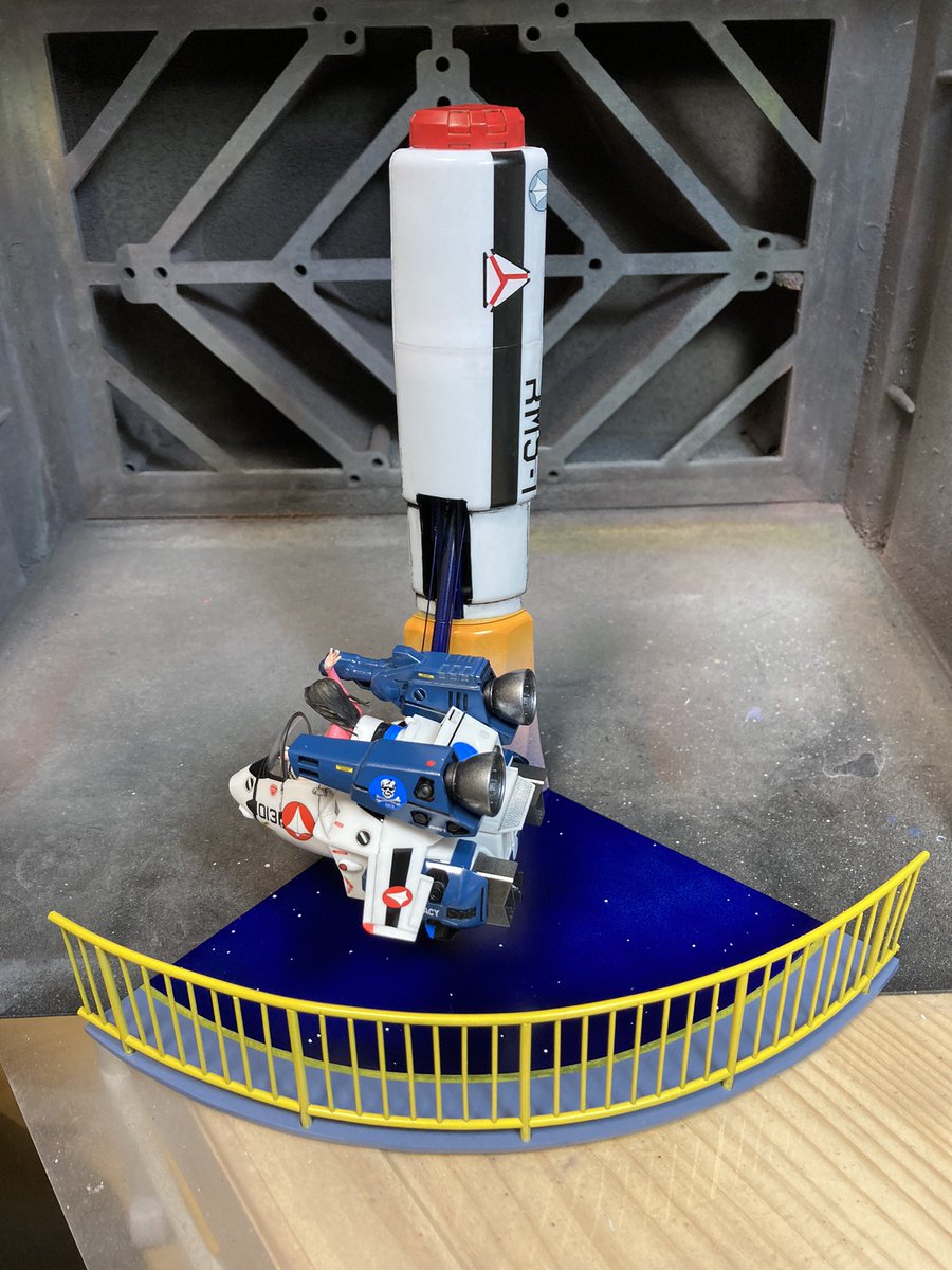 機体にスミ入れ。 地面に宇宙とキャットウォークを描きました。黄色い線は曲線に貼れるタミヤマスキングテープ。 ストックしてるデカールを切り貼りして反応弾にマーキングを施しました。 #たまごひこーきマクロス #ハセガワ