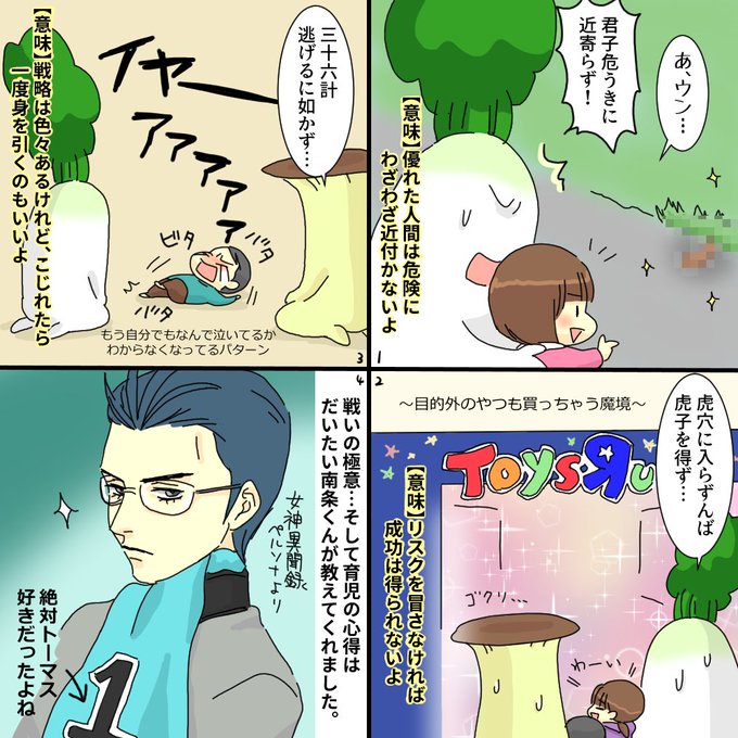 トイザらスも西松屋もバースデイも百均も虎穴。 #たんこんち #トイザらスマジ虎穴 #育児 #子育てあるある #育児ことわざ #育児絵日記 #育児漫画 #4コマ漫画 #女神異聞録ペルソナ #南条圭 #トーマスとエドワードを間違えて怒られる山岡とかさ…