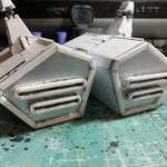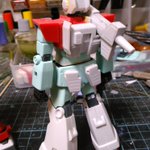 #だいたいこんな感じ見た人もやってみるw ①1/72ダグラム頭の各辺をデバイダで測る。 ②デバイダの3倍で3ミリプラ棒を切り、プラ棒接着 ③プラバン貼ってハサミで切る ④塗装して1/24ダグラム頭が出来上がる