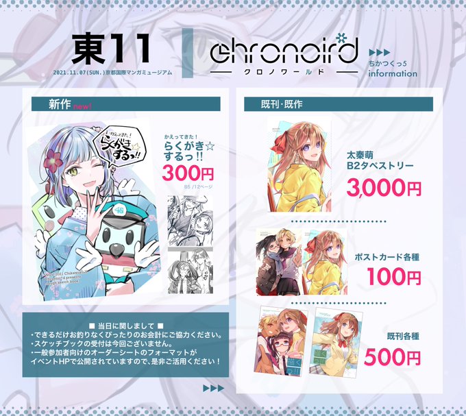【告知】 11/7 京都国際マンガミュージアムで開催されるイベント #ちかつくっ5 に参加いたします! お品書きはこちらです。くろなゆたもいます。 当日はよろしくお願いいたします!🙏 以下当日参加される方向けのお知らせです。 こちらも合わせてご確認くださいませ😷 ▼ chikatsuku.com/participant05