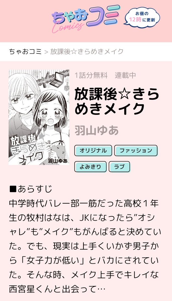 💄お知らせ💄 ちゃおコミにて新作読みきり 「放課後☆きらめきメイク」が配信中です!💗✧˖° メイクがモチーフのマンガをずっと描きたいと思っていたので、楽しく描かせていただきました🫶🏻✨ リンクから無料で読めますのでよろしくお願いします!🥰 #ちゃおコミ ciao.shogakukan.co.jp/webwork/20968/
