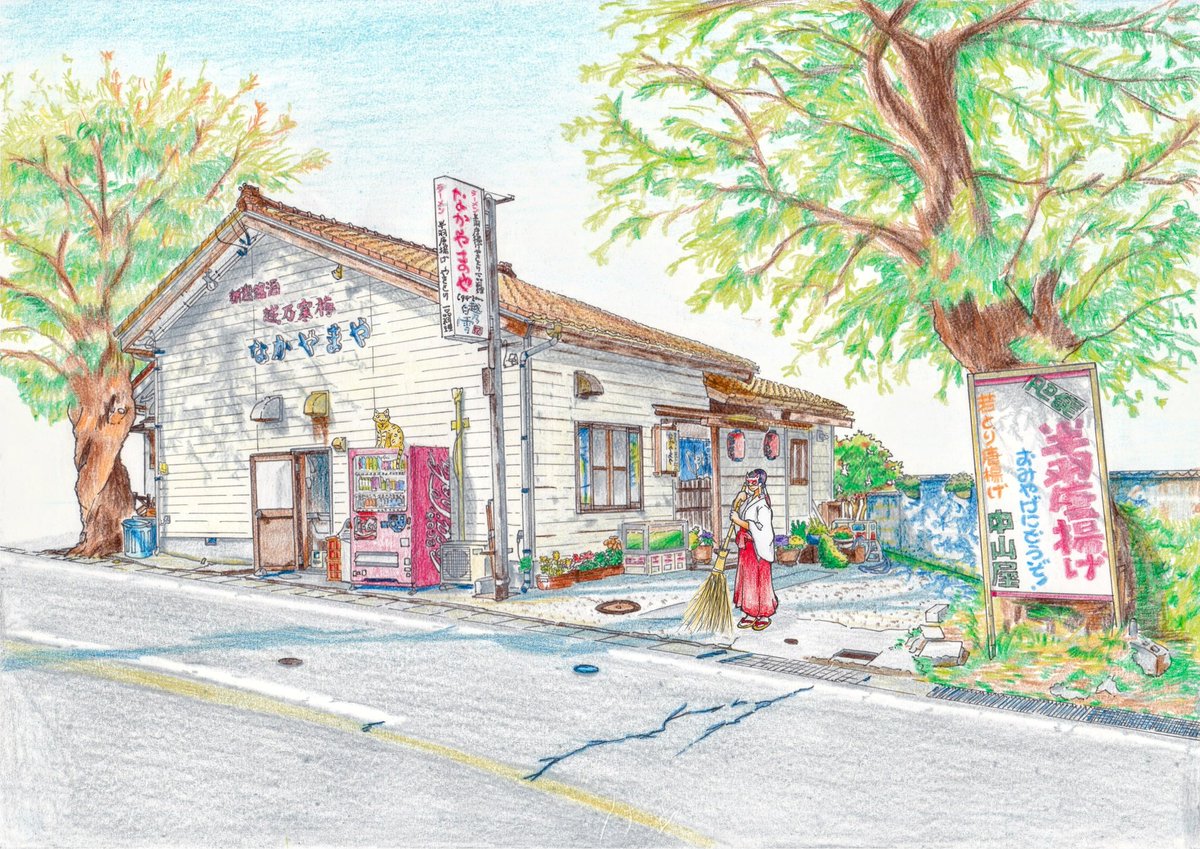 新潟県弥彦村のお食事処。 「なかやまや」さんを描きました。弥彦駅と弥彦神社も近く、特に半羽唐揚げが美味しいです!是非行ってみて! 猫と弥彦神社の巫女いるよ版もあります!笑 【↓Google検索リンク🔗】 g.co/kgs/k6KWRU #ちゃっく猫 #弥彦村 #絵描きさんと繋がりたい #芸術同盟