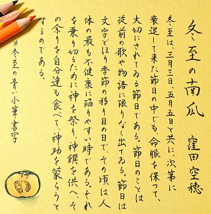#冬至の青い小筆書写 お題の2つめ。 行間が揃わないなあ。 今日は我が家ではかぼちゃも柚子湯も無いです…書写くらいは冬至らしく書きませう🎃 #ちょこっとイラスト #色鉛筆 #500色の色鉛筆 #筆ごこち