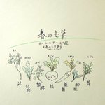 #春の七草書写 素敵なお題をありがとうございます✨ 達筆な方に、正統派の書写はお任せして、私はいつもの感じで参加します 色上質紙に描いたんですが、どうにも紙色がちゃんと出ません…黄緑なんです #ちょこっとイラスト #水彩