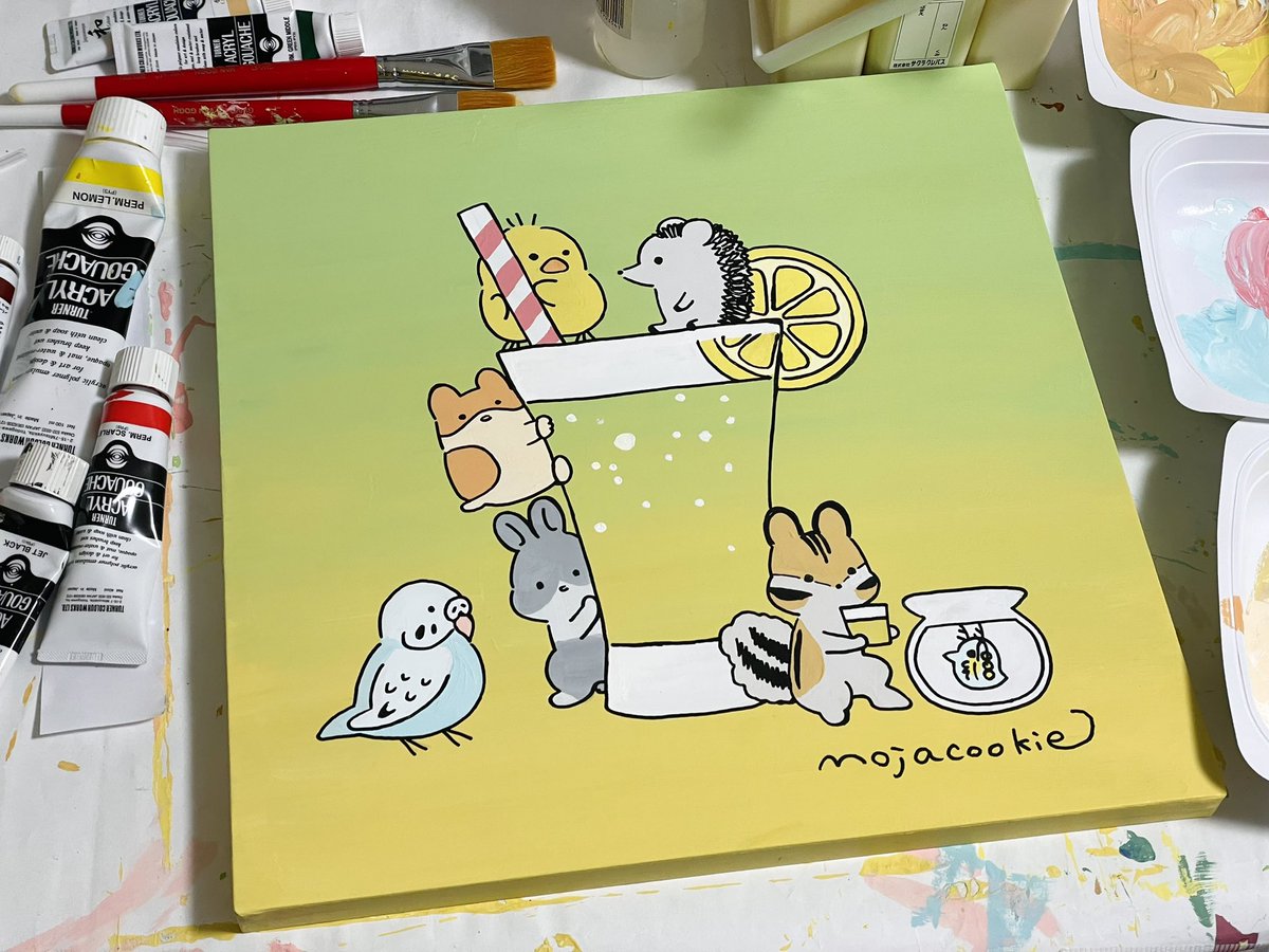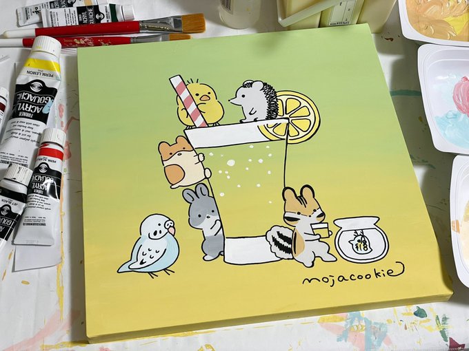 \🍪今年も個展!🍪/ 『#しかるねこ原画展2(にゃん) 〜作者・もじゃクッキーによる描きおろしアート〜』 アクリルガッシュで描いてます🎨 色合いやタッチを、ぜひ生で見てほしい…! 前回に引き続き『#ヒヨハリ』たちの絵もあります〜! #ちょっぴりおしゃべりでちょっぴり個性的などうぶつさんたち twitter.com/shikaruneko/st…