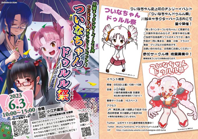 #ついなちゃんドゥルル祭 チラシが完成しました!ついなちゃん参加の各イベントなどで配布されますよ~! イラストは #ついなちゃんドゥルル祭イラコン エントリー作品より、 表面(左)あきch様 裏面(右)水っぽいスープ様・南ぎふと様 yukoduka.wixsite.com/kawagoe-cb5-tu…