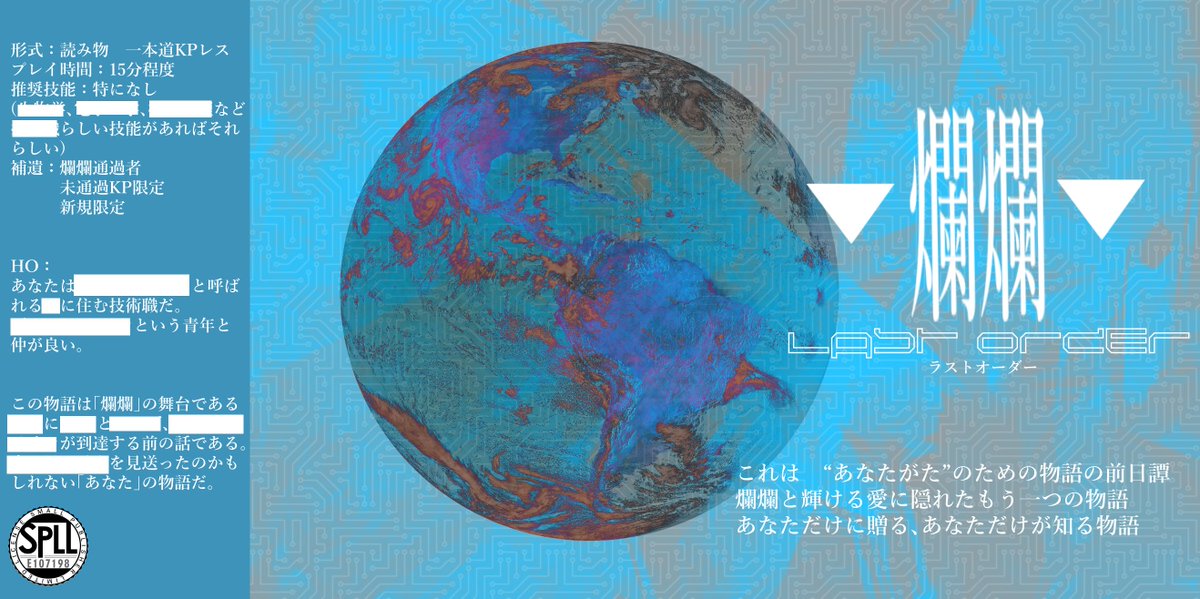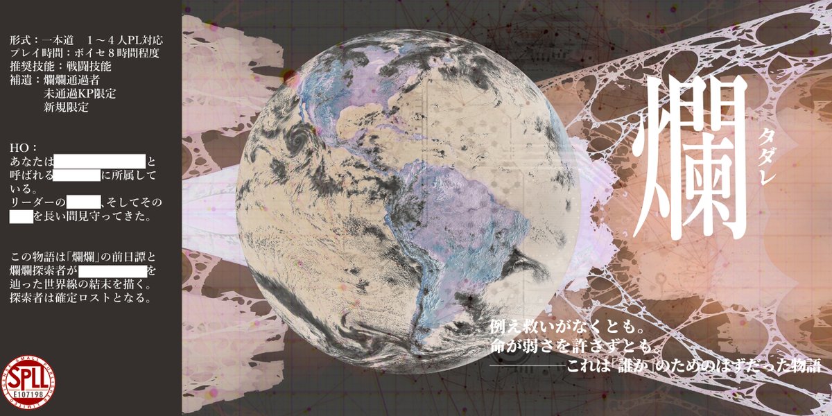 #つきめぐり公式アナウンス 拙作「爛爛」に2年越しに入れ忘れていたスチルがあったことに気付いたので、1枚スチルを追加しました お手数ですがご購入者様は「入れ忘れスチル.zip」ファイルをDLお願いします!:: 【COCシナリオ】爛爛【2PL秘匿HO】 | つきめぐり tukimeguri.booth.pm/items/3086808