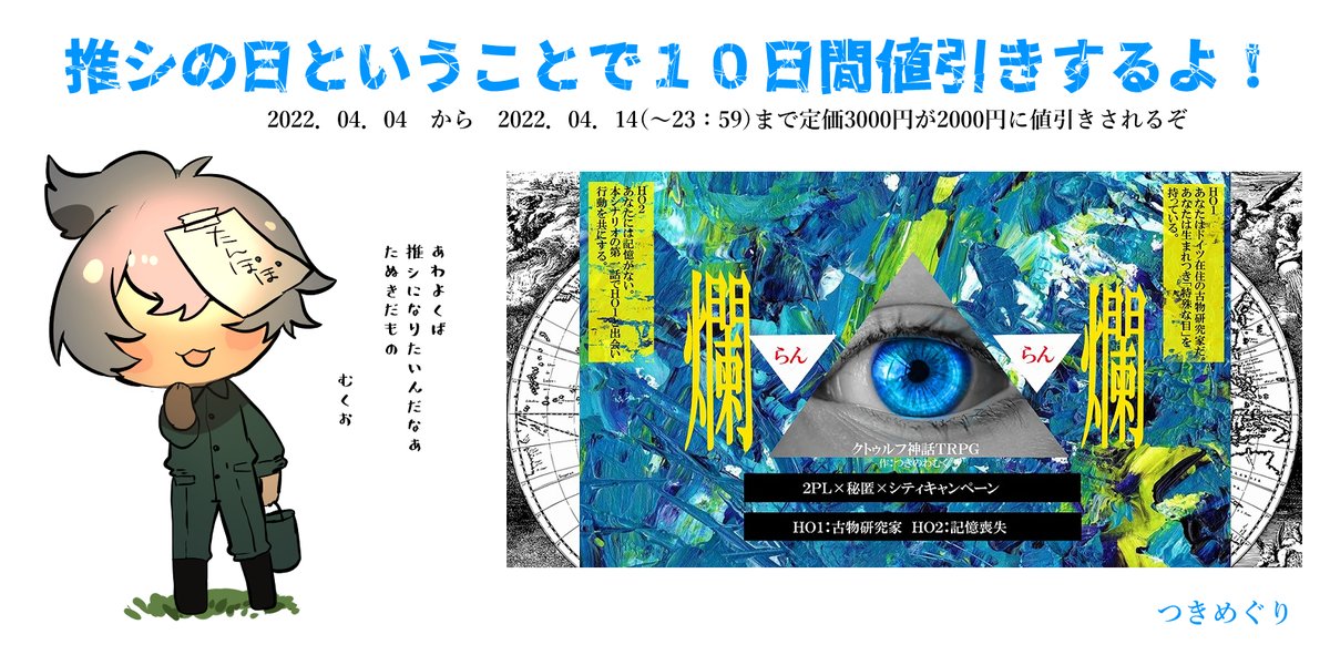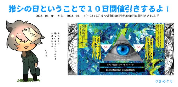 #つきめぐり公式アナウンス 予告通り以下のシナリオのセールを実施します! 4月1日~4月30日 ▼爛爛 tukimeguri.booth.pm/items/3086808 ▼煌煌 tukimeguri.booth.pm/items/4095427 ▼爛爛サウンドトラック&追加コンテンツ tukimeguri.booth.pm/items/3689766