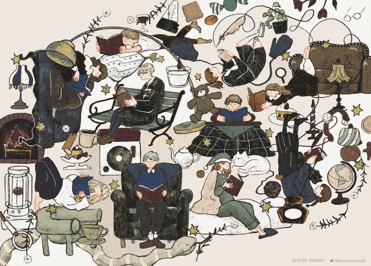 つくしのブックカバー展に出した作品です。 読書自体集中できるので結構好きなんですが 気持ちのいい空間で猫に囲まれながら本を読めたらもっと幸せだろうな と思って描きました。 右下には本にまつわる格言を入れています。 「良い本は私の人生におけるイベントである。」 #つくしのブックカバー展 twitter.com/tsukushiso/sta…