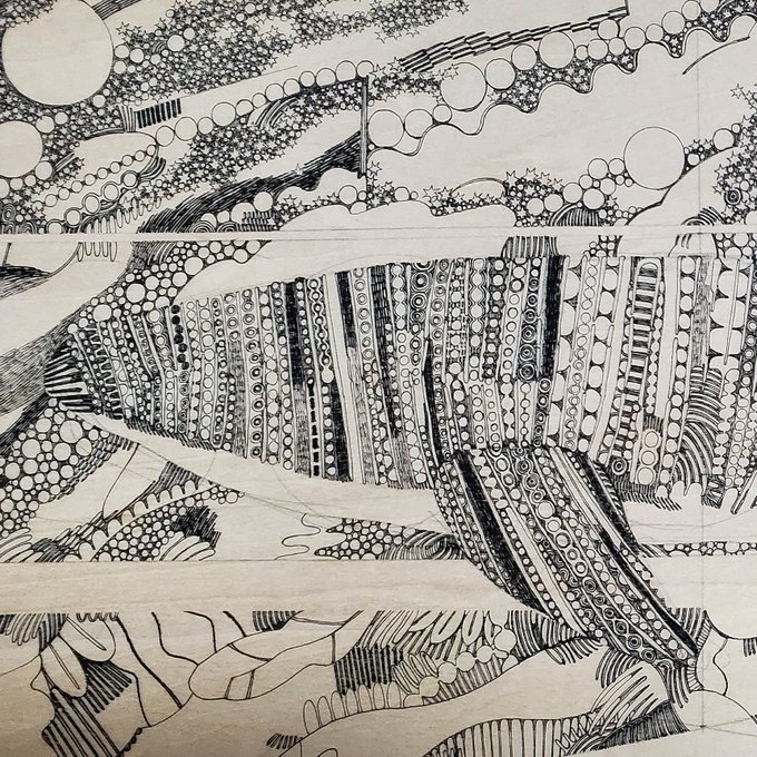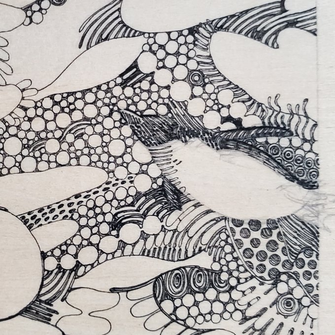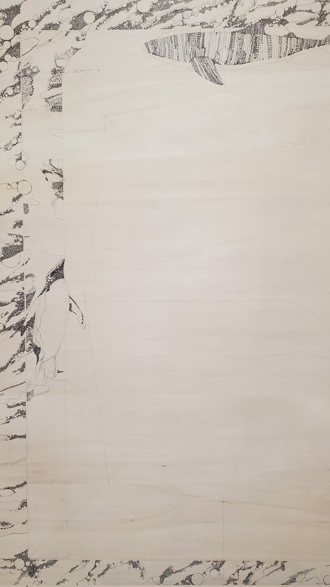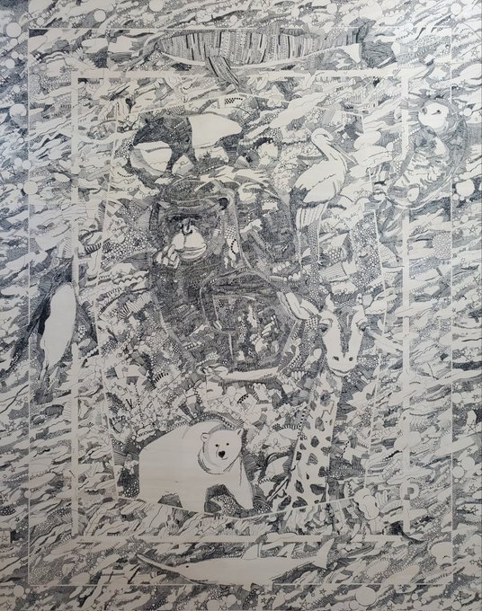 つづき。 制作中の一部。 今回こそは余裕をもって制作するはずが、いつも通りのギリギリです。 9/13から開催するつくしの半年大作展に出品予定のペン画。 F50号のパネルに描いています。 #ペン画 #つくしの半年大作展