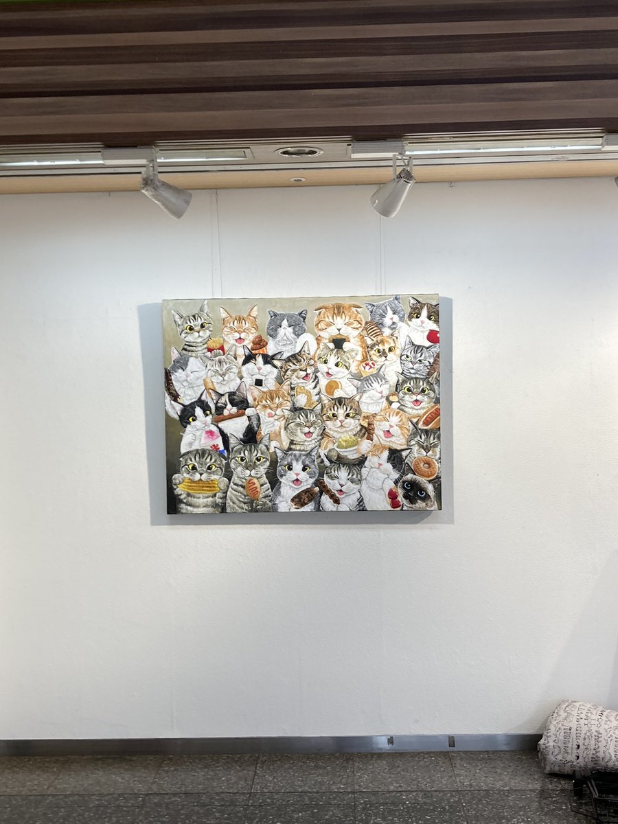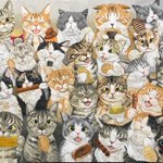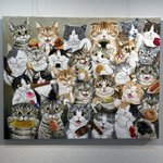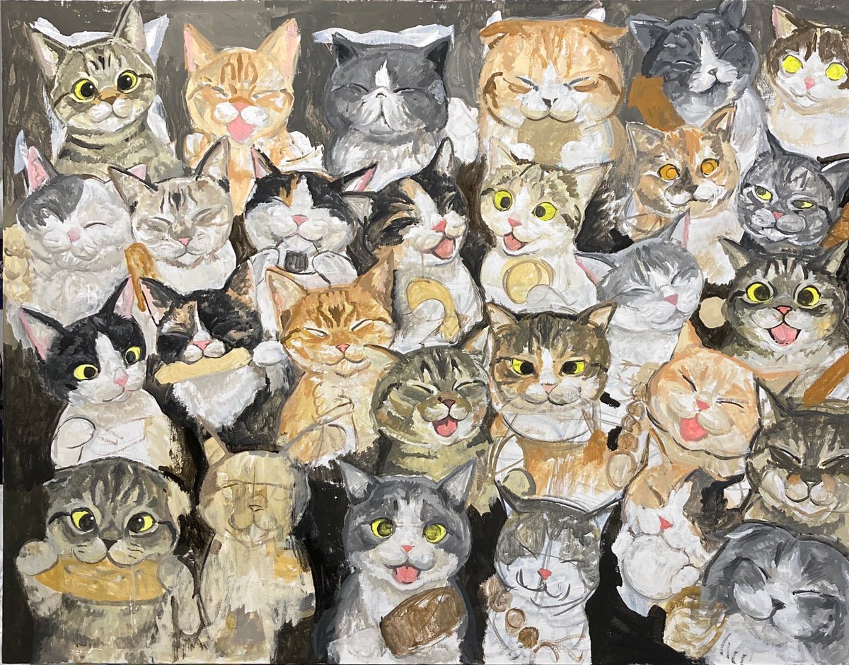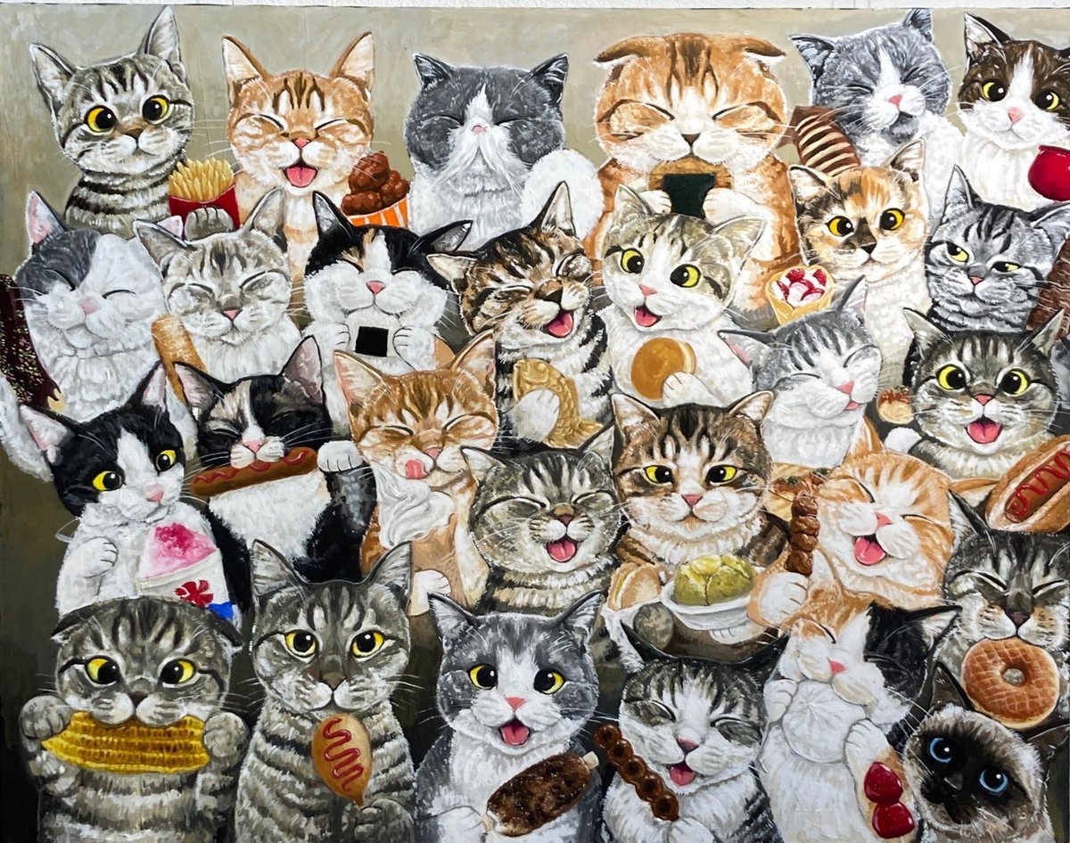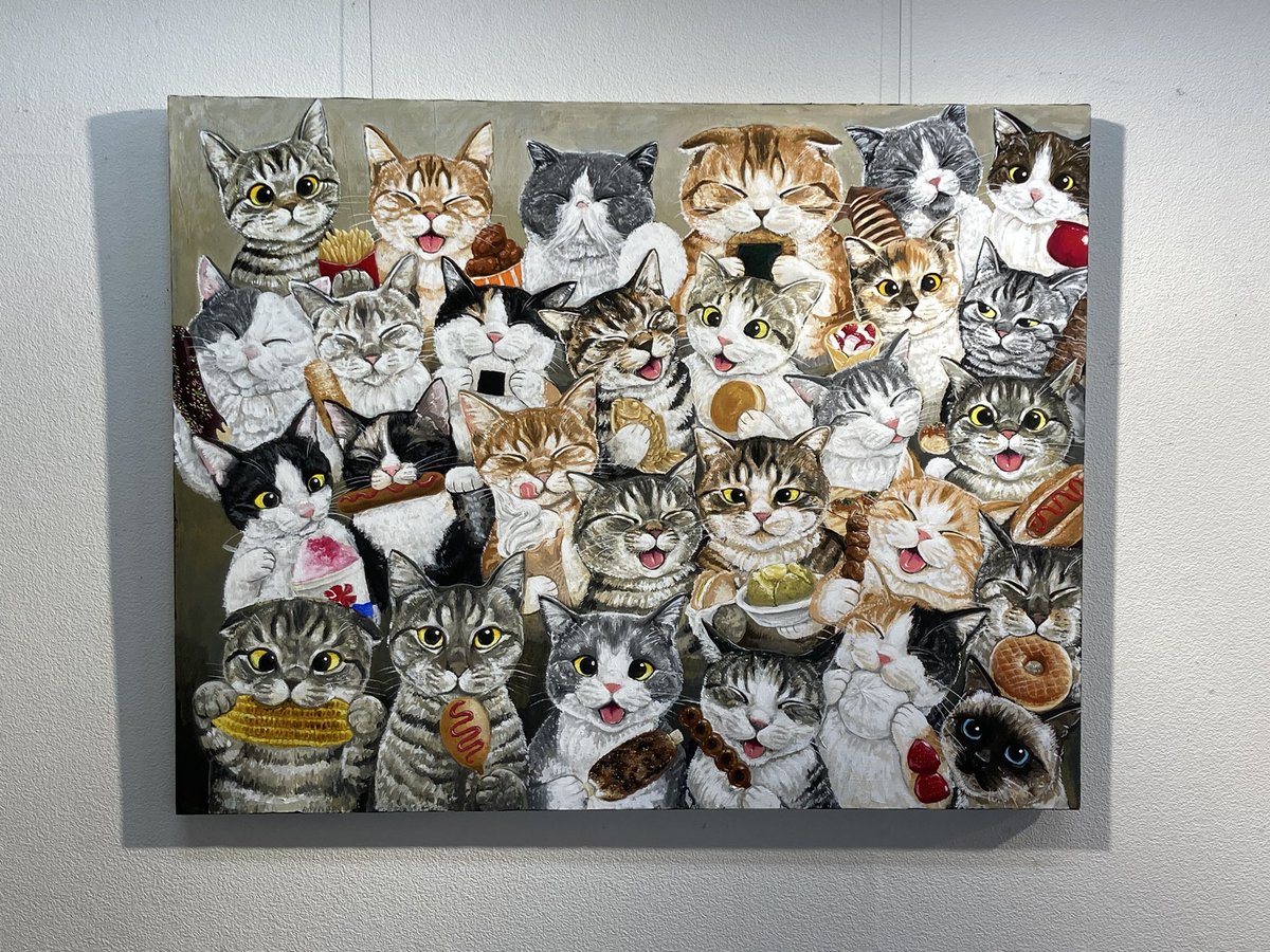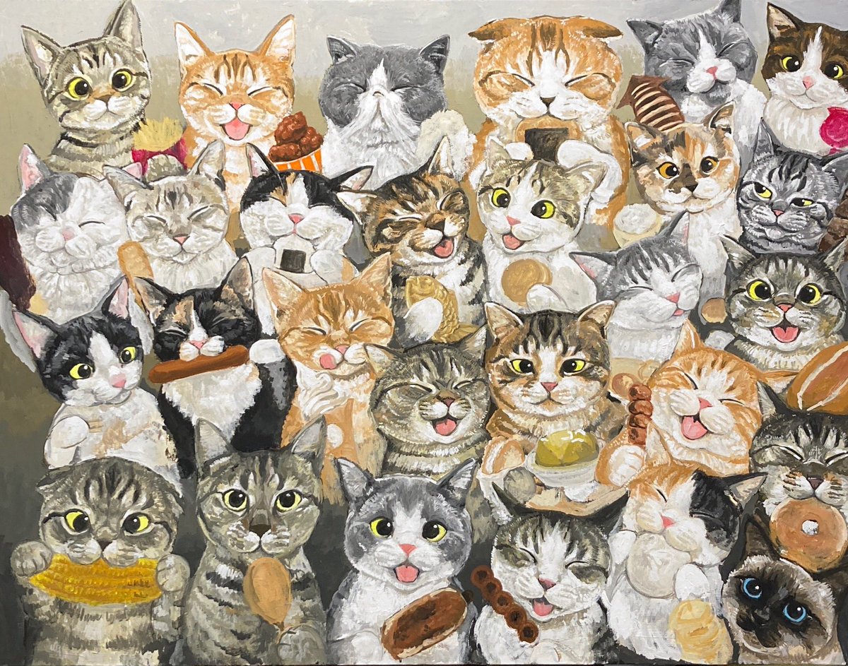 #つくしの半年大作展 みんなでパーティー🥳 アクリルガッシュ キャンバスF50 半年かけて描いた絵が完成しました♪ 28匹のニャンコさん達が何かを食べています♪ たのしんでみてくださいね💕💕 9.13(火)〜9.25(日) @セントラルパークギャラリー(名古屋)