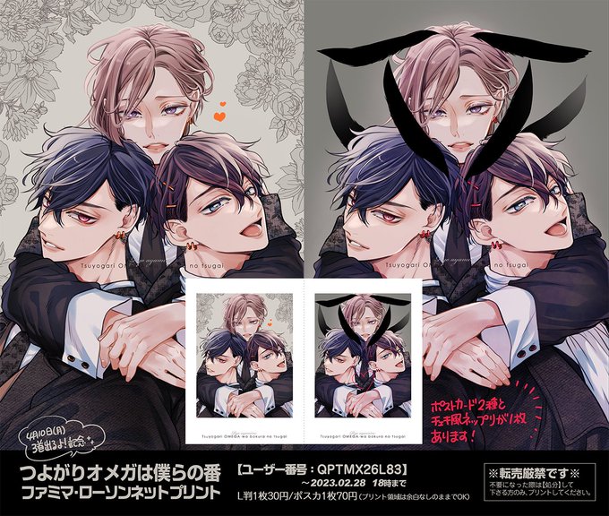 最終週のネップリ登録をしてきました🌸 三人の登録は4/23まで、侑也と一緒にプリント出来る期間は4/16までです!いよいよ明日はコミックス3巻発売日です、どうぞよろしくお願いします~!💙💖❤️ (🇹🇼🇰🇷はツリーをご覧ください) #つよがりオメガは僕らの番 #創作BL