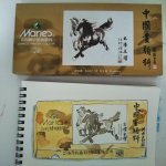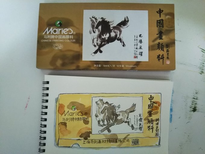 中国画顔料を描きました。5mlだから少ない💦それと液体で初めは出てくる。ひとつひとつ銀紙で蓋してあるけど。これで最近の猫の墨彩画描いてます。右上に雀が描いてあったのと、リキュちゃんに似たお馬さんだったのでモチーフにしてみました🤣 #つらら庵お散歩スケッチ