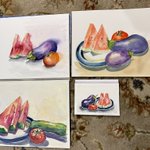 We painted watermelon and summer vegetables today. 外は暑いのでスイカと夏野菜の静物画を描きました。つらら庵のビデオの様にはさらっと描けなくて悪戦苦闘。 #つらら庵お散歩スケッチ #winsorandnewtonwatercolor #waterfordpaper #stcuthbertsmill
