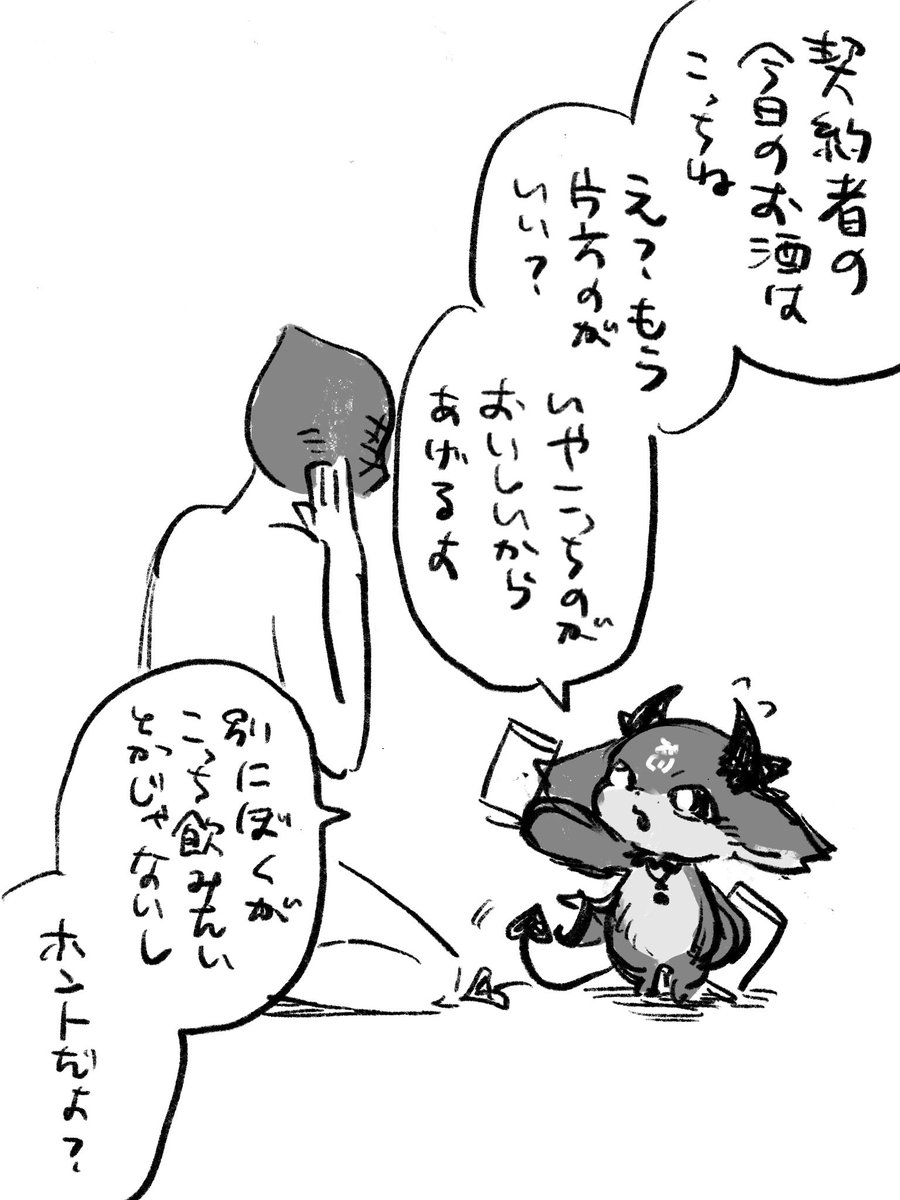 こんな事言われたら絶対何ターンかは「そっちのお酒がいいなー」(チラッチラッ)ってやってでびさまを困らせる遊びをしてしまう でびさまも「え、え〜〜〜でもお〜〜〜こっちのが美味しいよ?」って対抗し続けてほしい #でびるさまにささげるえ #でびるさまのせりふ