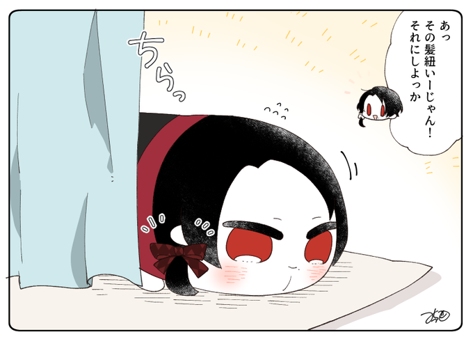 とある本丸のひと休み527「ちらっ・もちきよの本丸」 #とある本丸のひと休み 新しい髪紐の試着をしているもちきよくん🎀 おしゃれにはいつでも全力です!😊🌸 twitter.com/333_mitch/stat…
