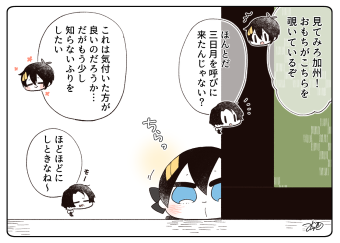 とある本丸のひと休み525「ちらっ・大きなもちちかの本丸」 #とある本丸のひと休み 大きなもちちかと隠れ鬼をしている三日月くん。鬼の三日月くんが探しにいくと……??😌 twitter.com/333_mitch/stat…