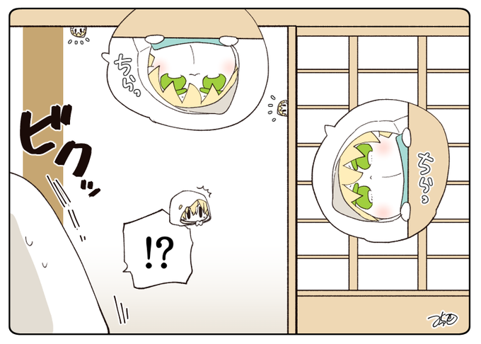 とある本丸のひと休み522「ちらっ・くまみみ本丸」 #とある本丸のひと休み とんでもないところからチラッとする左右にビビるまんばくん😂 たまに驚かしてくる左右です😌 twitter.com/333_mitch/stat…