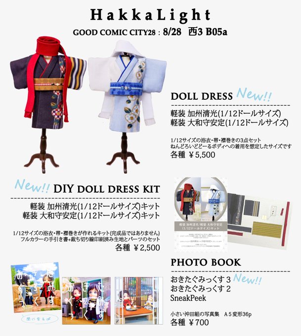 🌷お品書き🌷 ♡RTうれしいです♡ 12/18 COMIC CITY SPARK 17 閃華の刻 40 【 HakkaLight 】 ▶︎南4ホール め24a ねんどろいどどーるサイズのお洋服 清光 安定の軽装、羽織り、着物セットなど (BOOTHにも詳細記載予定) hakkalight.booth.pm ツリーに随時追記予定です 続↓ #とうらぶ手芸部