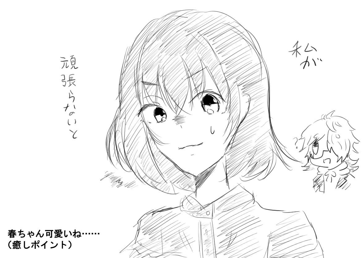 春ちゃんがしょんぼりしてるの見かねて声かけたのかな?というイラスト。でもコーサカはコーサカで危険な目に遭わないようにという優しさでお留守番させようとしたんだろうな〜 あの家に何がいるのか、次回も楽しみ! #MZMart #怪物男子と見えちゃう私 #とえちゃう