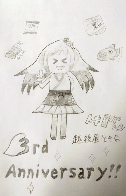 越後屋ときなちゃんが8月1日で活動3周年ということで! 3周年イラストを、アナログ絵とドット絵で描かせていただきました〜!😆✨ 活動3周年のお祝いなので、これまでの活動の中で特に好きなものをイラストに混ぜさせていただきましたッ!😆✨ 3周年おめでとうございます!😆 #ときな3周年イラスト