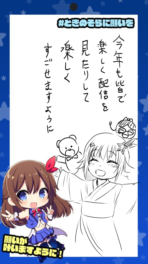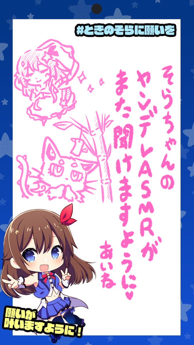 #ときのそらに願いを2023 6月末頃から体調がずっとどよーんしてるのですが、これだけはやっておきたいので (๑╹ᆺ╹)🌟!!!なんか去年もこの時期に調子悪くしてたなぁ…そういえば…(๑TᆺT)…。なのでちゃんと願っておきます(๑╹ᆺ╹)🙏✨!!!色んな事の反応が遅れてますがまたあとでね!!!