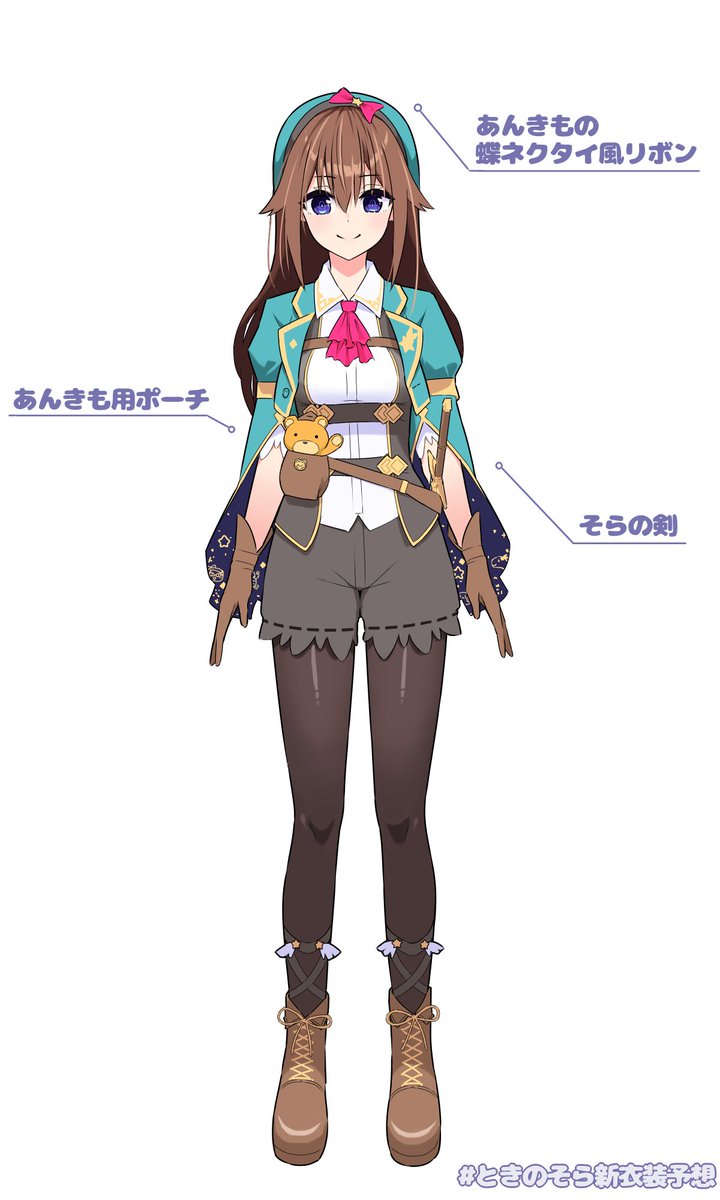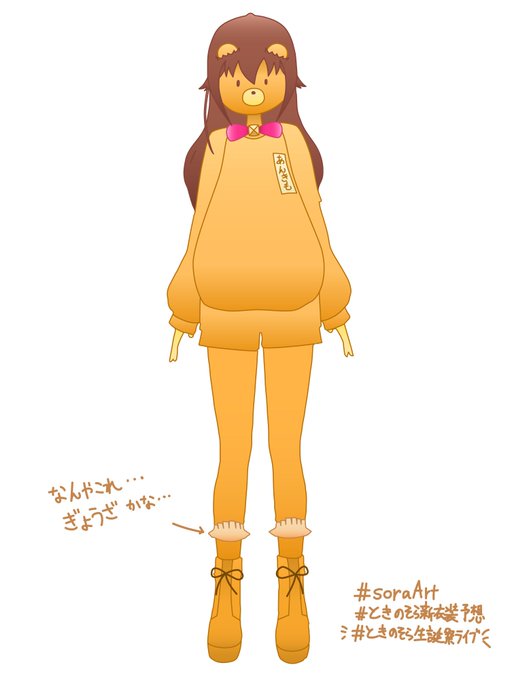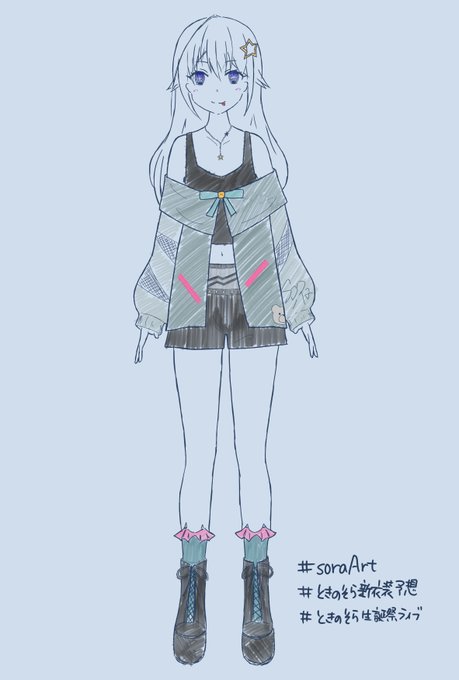 色んな話を聞いてみてタイトルの色に水色が使われてたのが気になった。 足首より上にリボンがあるかな? フード付きのパーカーだから髪飾りなさそう(๑╹ᆺ╹) #ときのそら新衣装予想 #soraArt