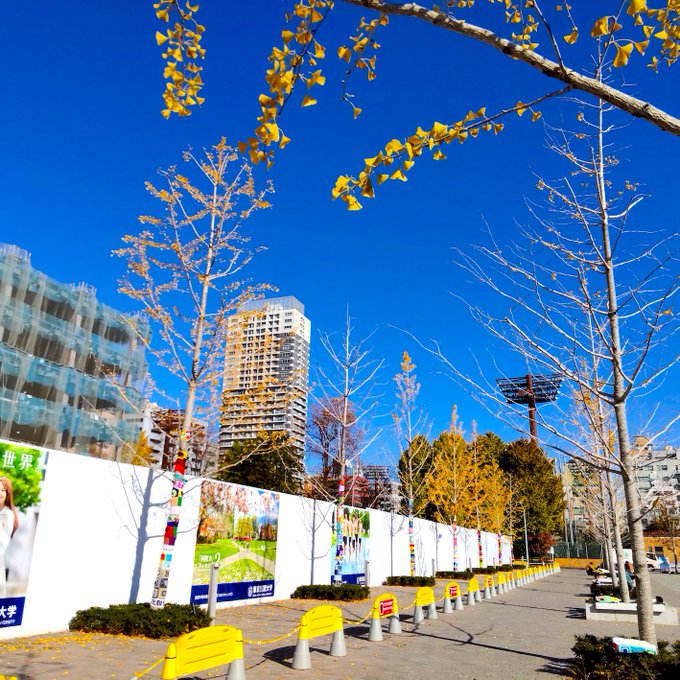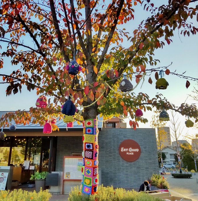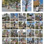 現在、#イケサンパーク 内のイチョウ並木に[◎▽◎]編みフクロウを編み巻きつけ作業進行中です!たくさん[◎▽◎]編みフクロウが集まったので、イチョウ並木以外の木々に予定。公園内ぐるっと一周出来るかな〜。巻きつけ作業は11/30迄続きまして12/1〜お披露目です! #としま編んでつなぐまちアート