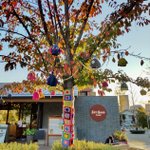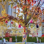 東池袋 #イケサンパーク 着々と編みふくろうの森に!イケサンパーク内のイチョウ並木(イケバスロード)を中心に編み飾り付け。お手伝いの皆様ありがとうございます!ミニ編みふくろうが揺れる木を見つけてね #としま編んでつなぐまちアート まちとひとを編み物でつなげるアートプロジェクト第二弾