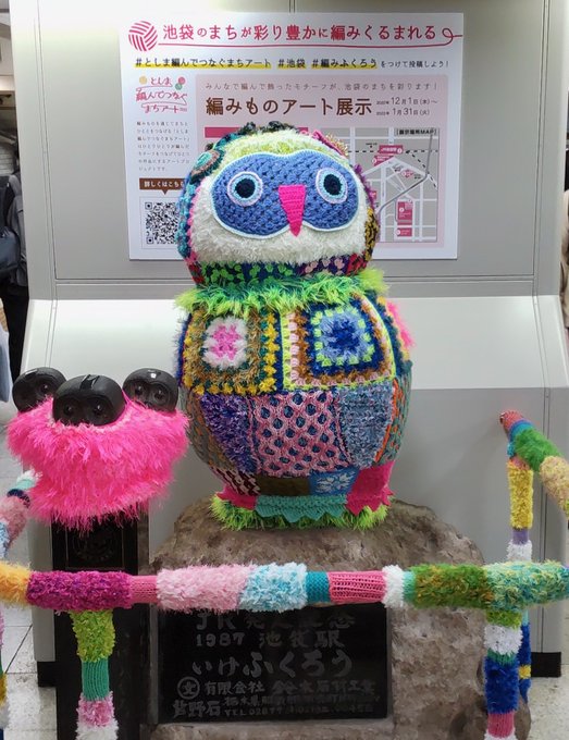 [#いけふくろう → #編みいけふくろう ]2022 JR池袋駅 東口方面に佇む「いけふくろう」石像を今年も"編みいけふくろう"装飾!〜2023/1/31迄 見た目に温かな冬のお待ち合わせに是非〜 #としま編んでつなぐまちアート 東池袋周辺8箇所編み装飾中 まちとひとを編み物でつなげるアートプロジェクト第二弾