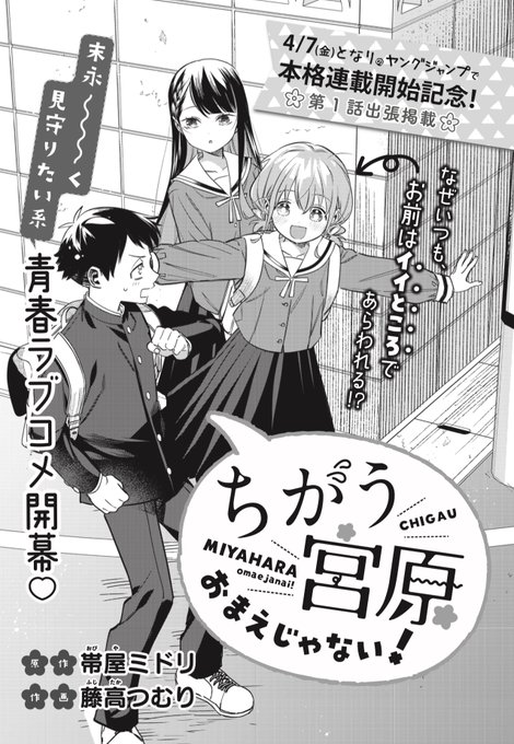 【お知らせ】 『#ちがう宮原おまえじゃない!』は明日4/7から #となりのヤングジャンプ で本格連載開始です!! それを記念して本日発売の週刊ヤングジャンプ19号に『#ちが宮』第1話が掲載されてます! 明日に備えてとなジャンで1~5話をおさらいだー! ここから読めます↓ tonarinoyj.jp/episode/316190…