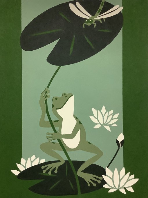 「回すよ〜」🐸 F0号 パネル 久しぶりにアクリル画描いてます 来年のカレンダーになる予定です #カエル #かえる #とんぼ #トンボ #アクリルガッシュ #イラスト #イラストレーション #frog #dragonfly #illustration